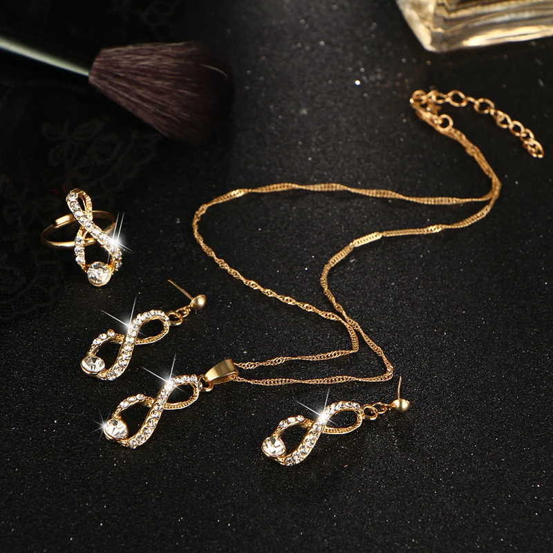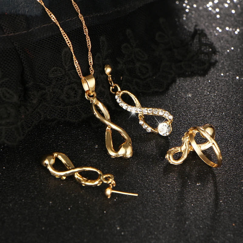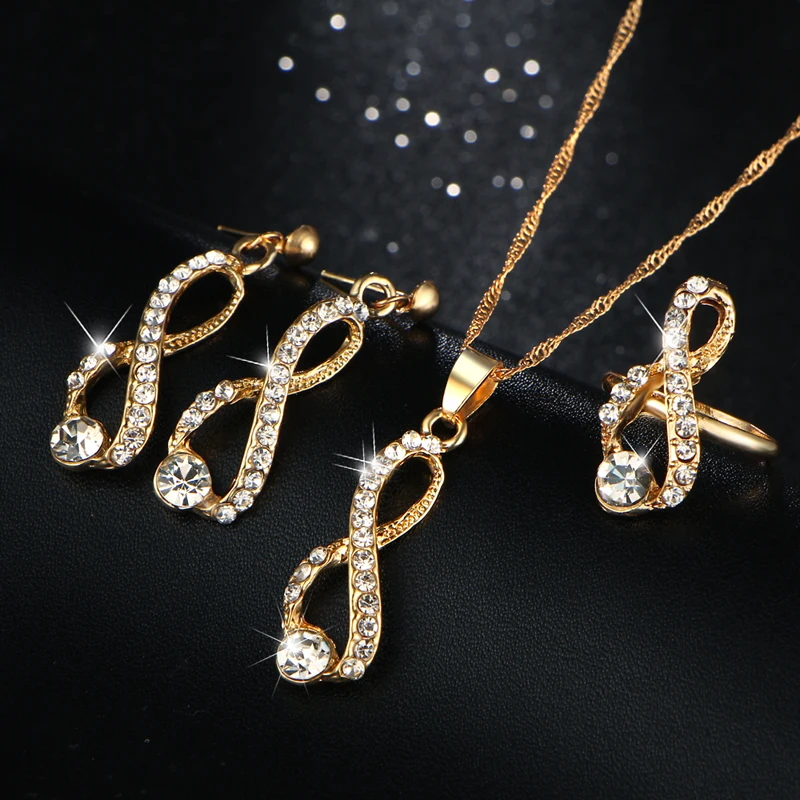 Promo 17KM Bridal Jewelry Set Crystal Long Necklace Infinite Earrings Gold Color Rings 2017 Simple Design