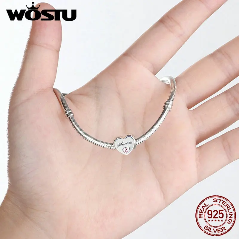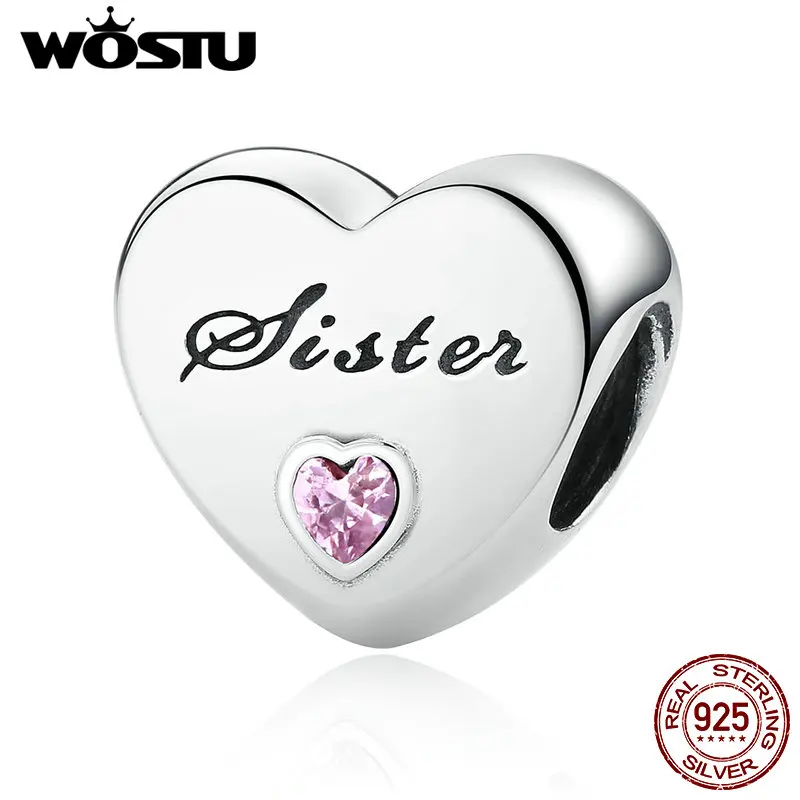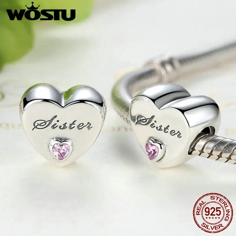 Promo Real 925 Sterling Silver Sister's Love Charm Bead With Pink CZ Fit Original WST Bracelet Bangle Aut